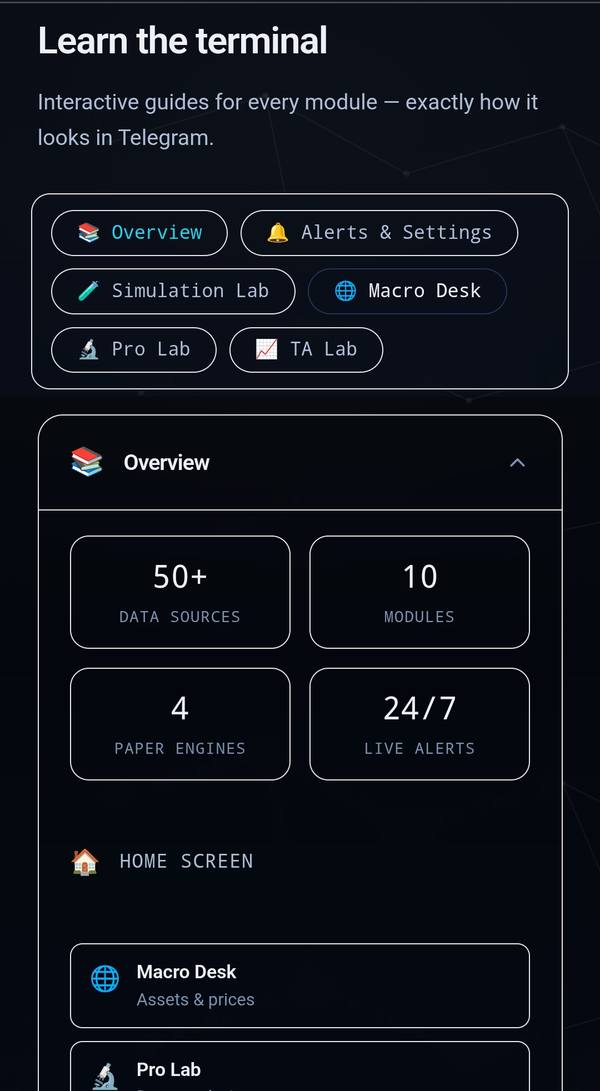 Data-heavy crypto intelligence terminal. 50+ sources, simulation lab, macro desk, live alerts.