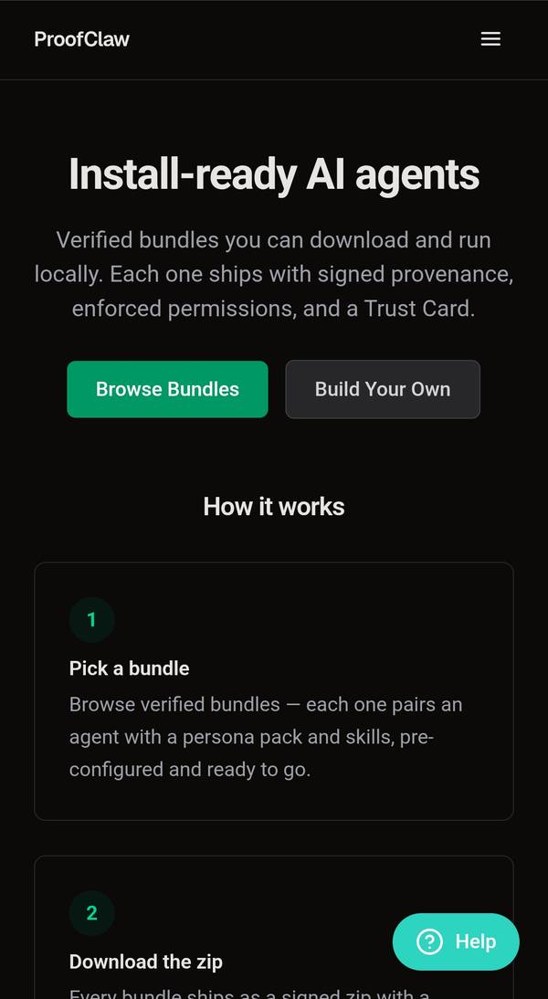 Install-ready AI agents. Verified bundles with signed provenance and Trust Cards.